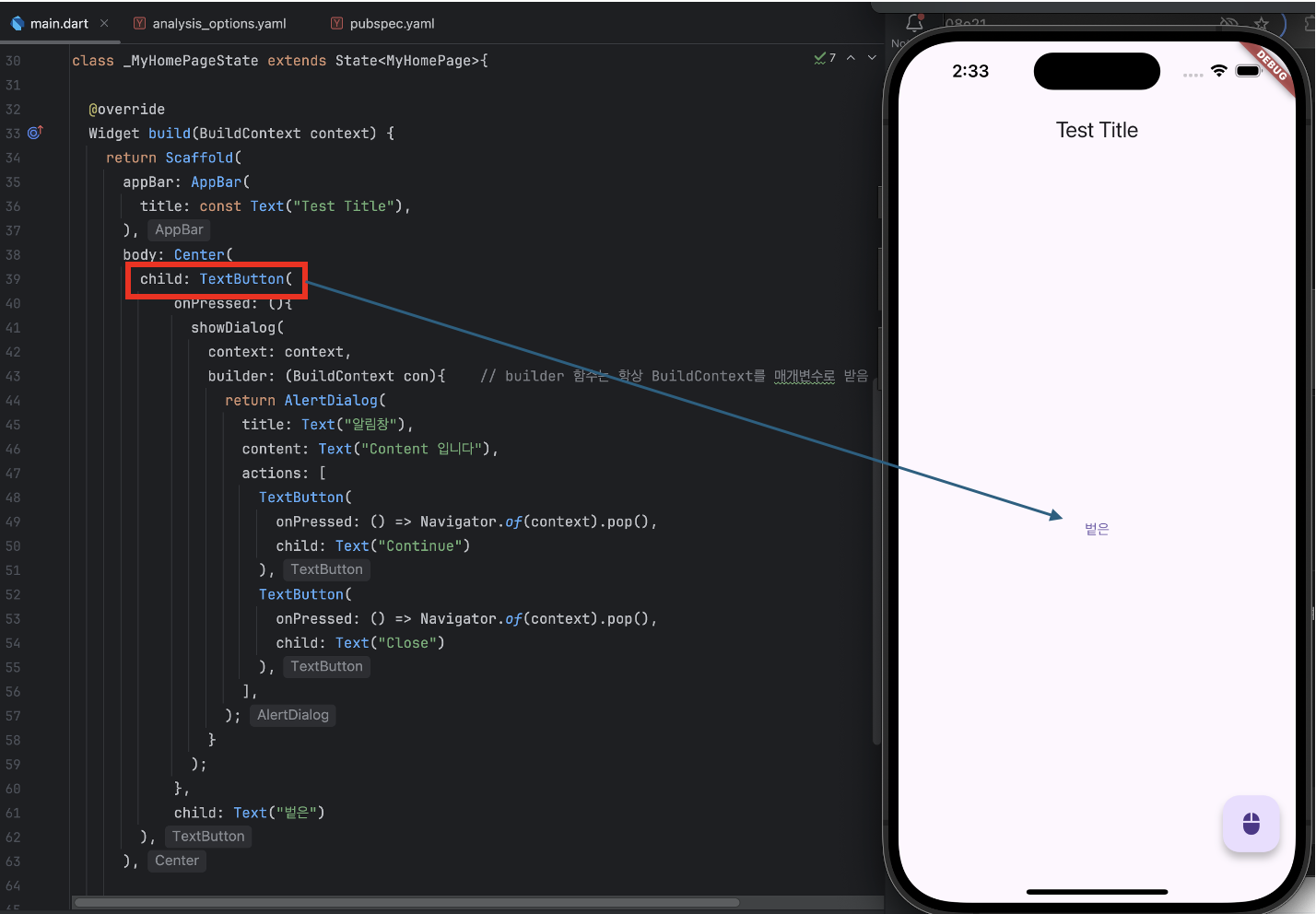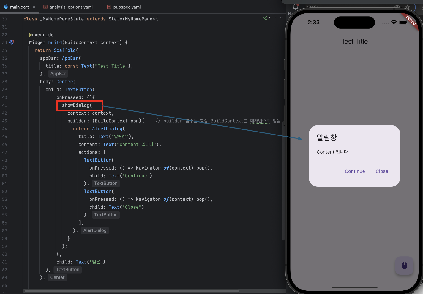 - 보통 showDialog 안에서 builder가 AlertDialog를 반환하도록 사용