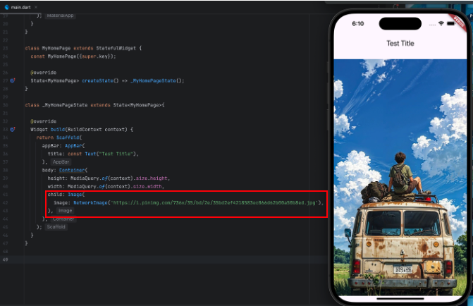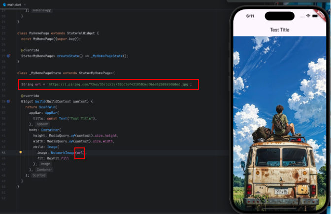 - NetworkImage() 위젯 내에 url 에서 복사한 이미지 입력