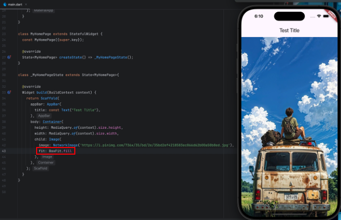 - 불러온 이미지 사이즈로 인해 생긴 여백은 fit 요소로 채우기 (fit : BoxFit.fill)