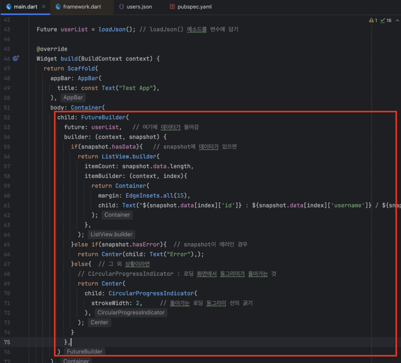 - snapshot.data : Future 가 성공했을 때 가져온 실제 데이터 (예: JSON 리스트, API 응답 값)