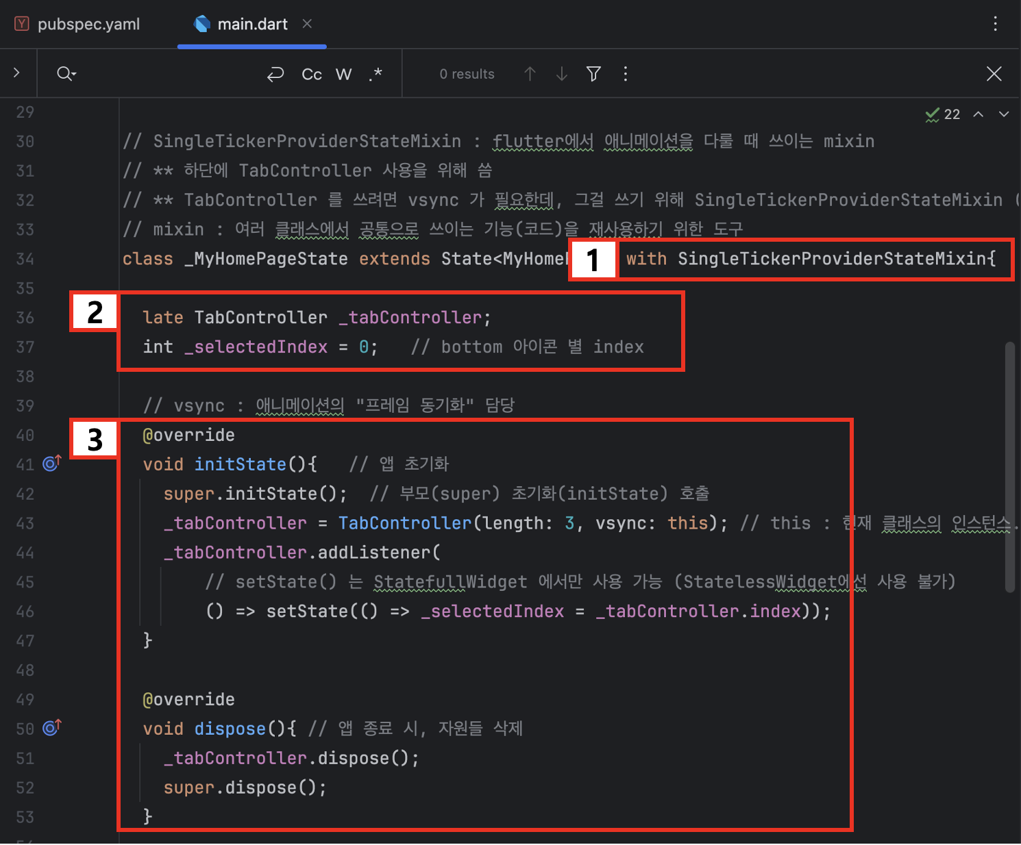 // ** TabController 를 쓰려면 vsync 가 필요한데, 그걸 쓰기 위해 SingleTickerProviderStateMixin (또는 TickerProviderStateMixin) 을 꼭 써야 함