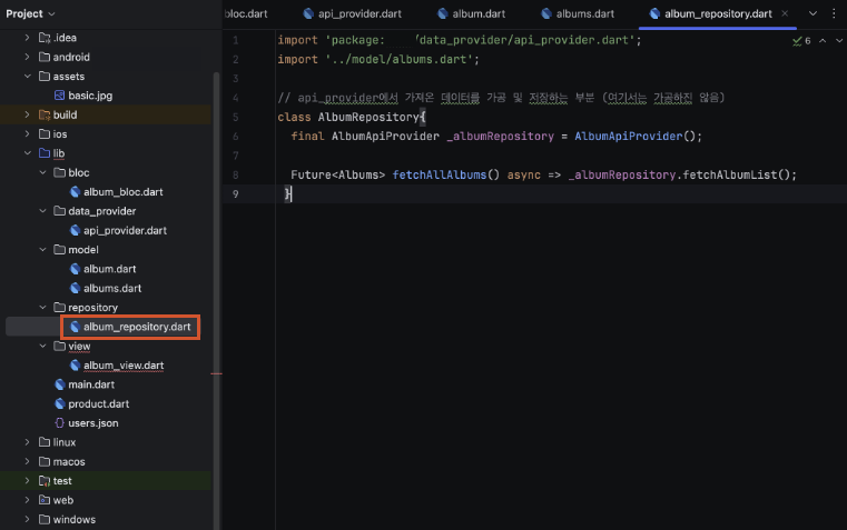 - album_repository.dart : 4️⃣에서 받은 데이터를 가공 및 저장
