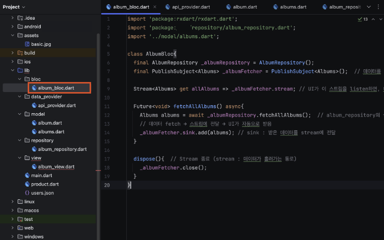 - album_bloc.dart : 5️⃣에서 가공 및 저장한 데이터를 stream에 전달