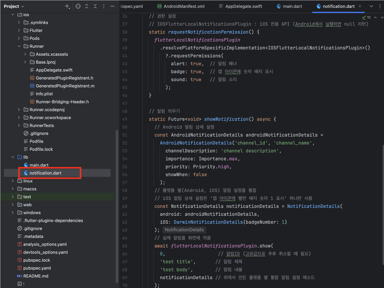 notificationDetails // 위에서 만든 플랫폼 별 통합 알림 설정 메소드
