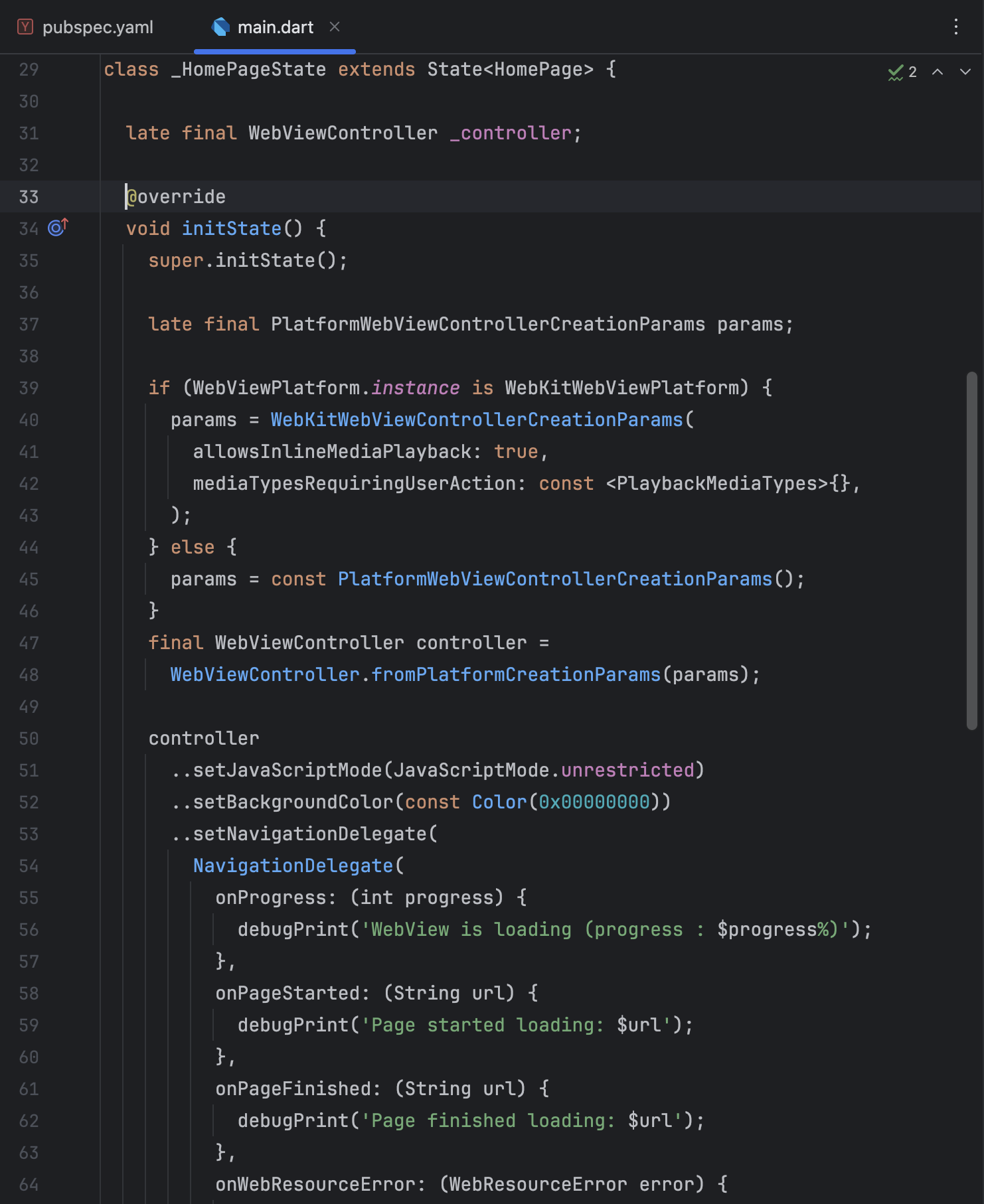 void initState() { // WebViewController 초기화 및 설정 작업 수행