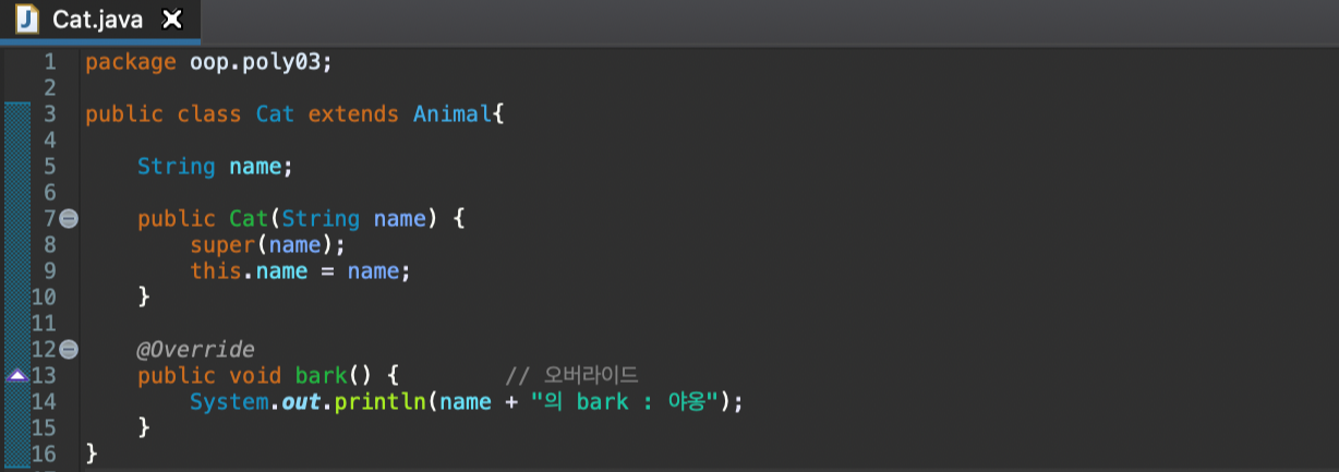 - 특징 : 자식 클래스에서 반드시 오버라이드해야 사용가능하며, 이때 구현부를 작성한다 (오버라이딩 메소드에는 abstract를 작성하지 않음)