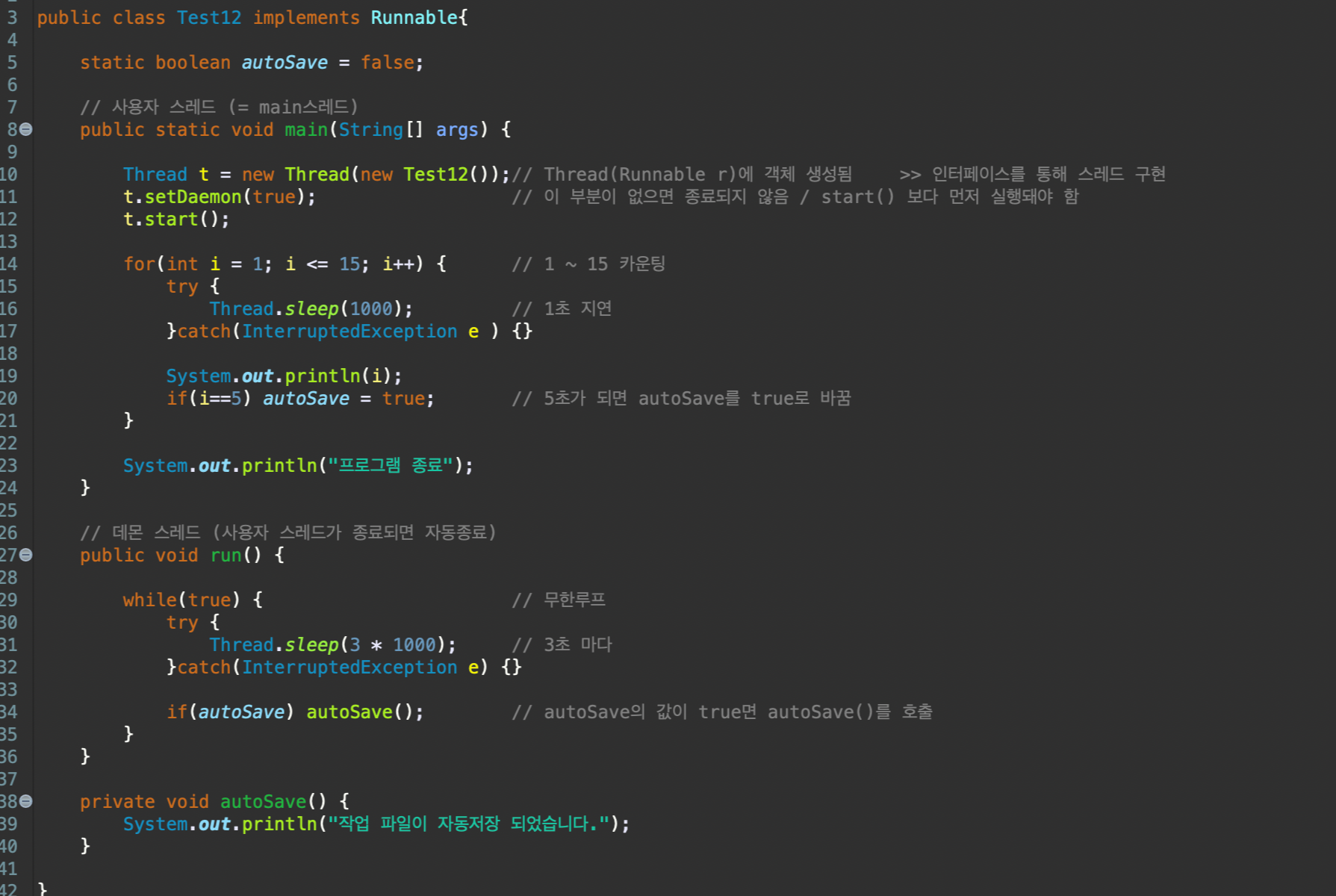 - boolean isDaemon() : 이 스레드가 데몬 스레드인지 확인 (맞으면 true)